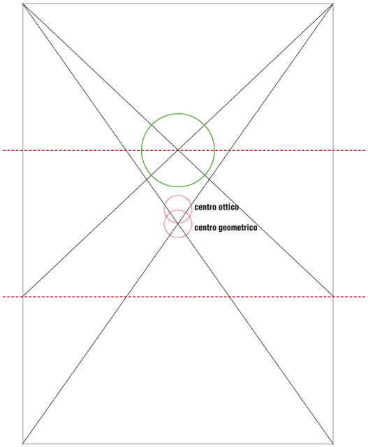 L’area in cui l’occhio cade quando guarda una pagina (contrassegnata dal cerchio verde) è sopra la linea mediana di uno spazio compositivo, sia esso quadrato o rettangolare, più precisamente leggermente al di sopra del centro ottico. Questo spazio gode di maggior visibilità e forza di attrazione probabilmente perché per questioni relative alle abitudini di lettura la nostra visione segue una progressione di osservazione da sinistra a destra e dal margine superiore della pagina a quello inferiore.